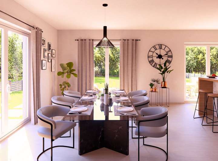 Dieses Hauskonzept überzeugt im Erdgeschoss mit einem weitläufigen Wohn Ess und Kochbereich, der durch Offenheit und viel Tageslicht ein einladendes Wohngefühl schafft. Ein Arbeitszimmer mit direktem Zugang zur Terrasse erweitert die Nutzungsmöglichkeiten und schafft Flexibilität im Alltag. Ergänzt wird diese Ebene durch eine praktische Ankleide sowie ein zusätzliches Bad.