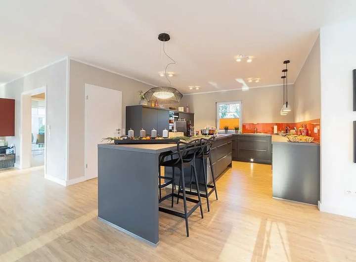 Die integrierte Einliegerwohnung im Erdgeschoss eröffnet zusätzliche Perspektiven. Eltern können komfortabel mit im Haus wohnen oder durch Vermietung entsteht ein wertvoller finanzieller Beitrag zur Finanzierung. Die Hauptwohnung bietet großzügigen Raum für Familien. Ein Schlafzimmer im Erdgeschoss sowie drei weitere Schlafräume im Obergeschoss sorgen für klare Rückzugsbereiche. Zwei Badezimmer unterstützen einen reibungslosen Tagesablauf. Der offen gestaltete Wohn und Essbereich bildet den zentralen Treffpunkt für gemeinsame Zeit und ein harmonisches Familienleben.