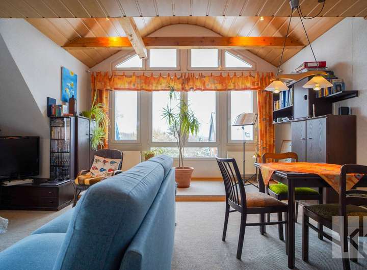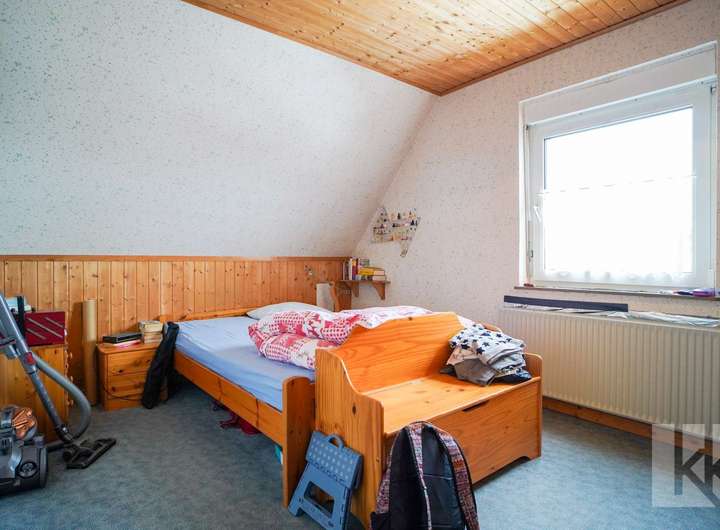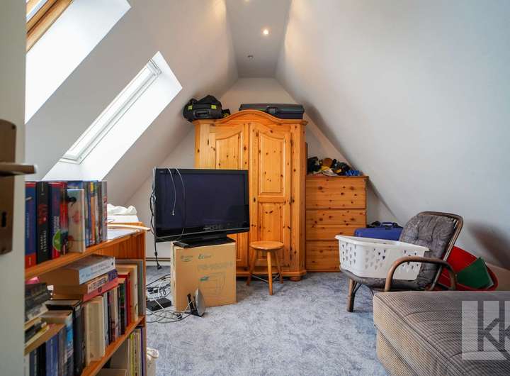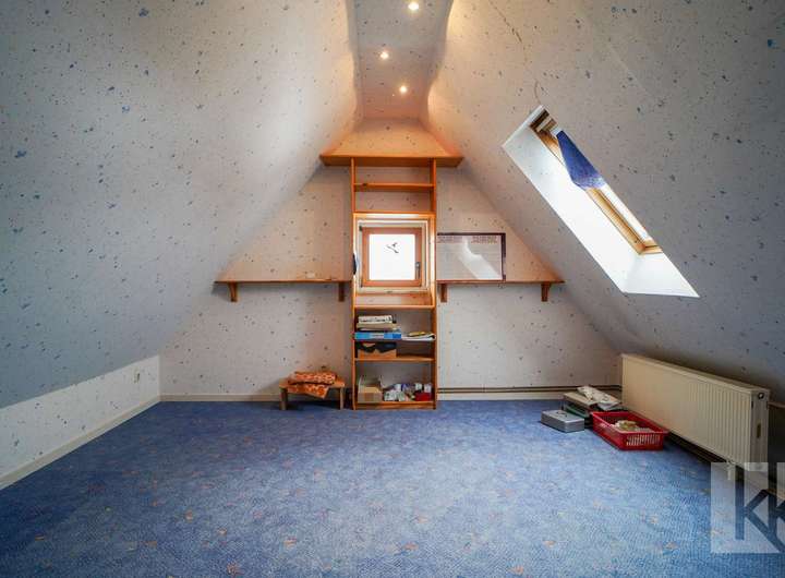 Über eine weitere Treppe gelangen Sie in das Dachgeschoss mit ausgebautem Spitzboden. Hier befinden sich ein großzügiges Zimmer, das sich ideal als Kinderzimmer oder zusätzlicher Wohnraum anbietet, sowie ein weiteres Zimmer, das sich gut als Homeoffice oder als Rückzugsort nutzen lässt.