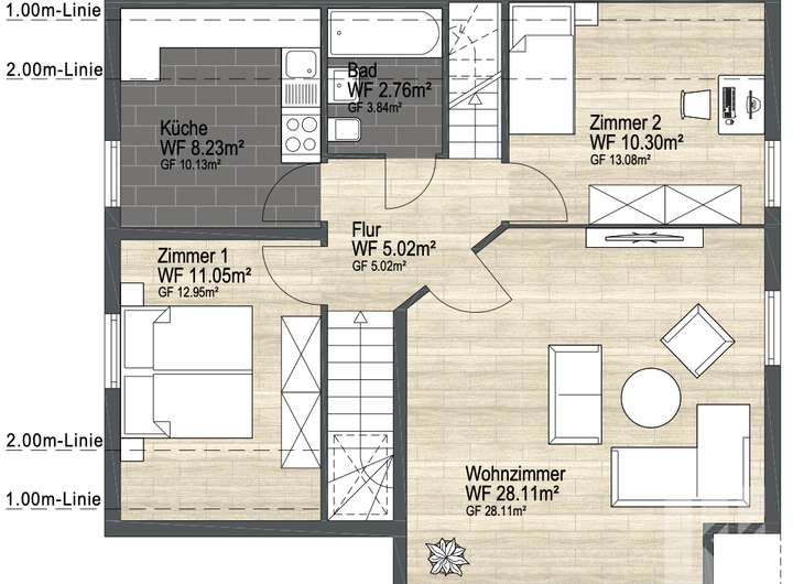 Im Obergeschoss eröffnet sich eine zweite Wohnebene mit vielseitigen Nutzungsmöglichkeiten. Neben einem weiteren Wohnzimmer mit heller, offener Atmosphäre und galerieartiger Fensterfront stehen Ihnen hier eine zusätzliche Küche, zwei flexibel nutzbare Schlafzimmer sowie ein weiteres Badezimmer mit Badewanne und Dusche zur Verfügung. Diese Etage eignet sich besonders gut für größere Familien oder individuelle Wohnlösungen, beispielsweise für Mehrgenerationenwohnen.