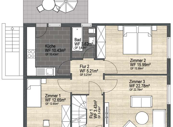 Das Erdgeschoss überzeugt durch eine helle und freundliche Wohnatmosphäre, die durch großzügige Fensterflächen unterstützt wird. Das Wohnzimmer bietet einen direkten Übergang zur Küche, von der aus Sie die überdachte Terrasse erreichen. Diese erweitert den Wohnraum ins Freie und bietet einen geschützten Platz für entspannte Stunden oder gesellige Abende. Ergänzt wird diese Ebene durch zwei Schlafzimmer sowie ein Badezimmer mit Badewanne und Dusche.