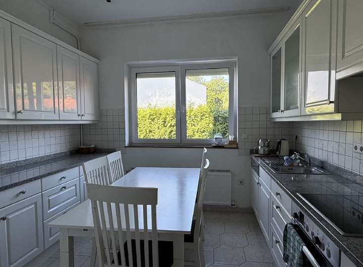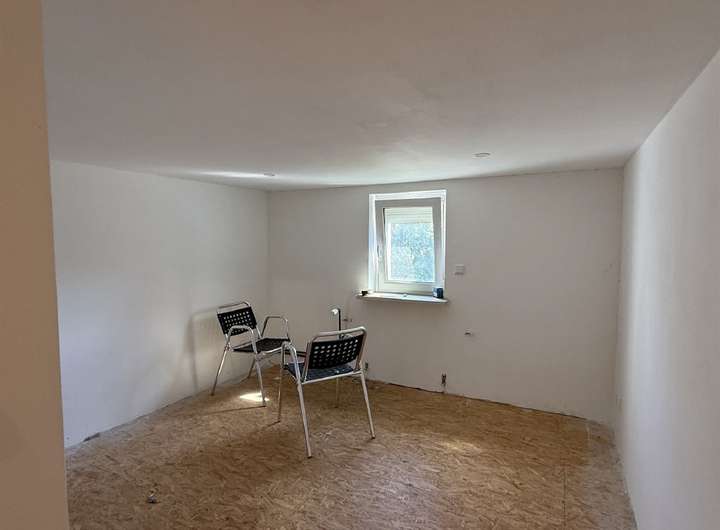 Im Obergeschoss stehen vier geräumige Zimmer zur Verfügung, von denen eines bei Bedarf wieder als Küche genutzt werden kann. Zudem ist hier ein weiteres Badezimmer vorhanden, das sich aktuell im Rohbauzustand befindet und Ihnen die Möglichkeit bietet, es ganz nach Ihren Vorstellungen zu gestalten. Der große Balkon erweitert den Wohnkomfort und lädt zu entspannten Momenten mit Blick ins Grüne ein.