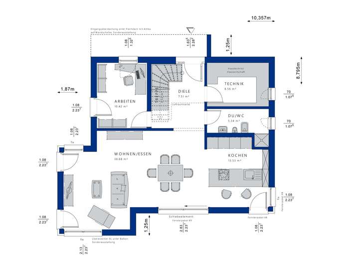 Malerarbeiten, Bodenbeläge, Innentüren und Sanitärobjekte fehlen bewusst, um Ihnen maximale Gestaltungsfreiheit zu lassen. Diese Gewerke können auf Wunsch selbstverständlich ergänzt werden.