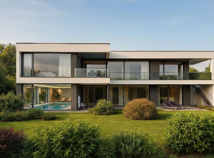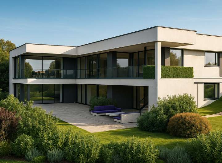 + Ein modernes Architektenhaus mit über 360 m² Wohnfläche, in klarer Formensprache und spektakulären Blickachsen.