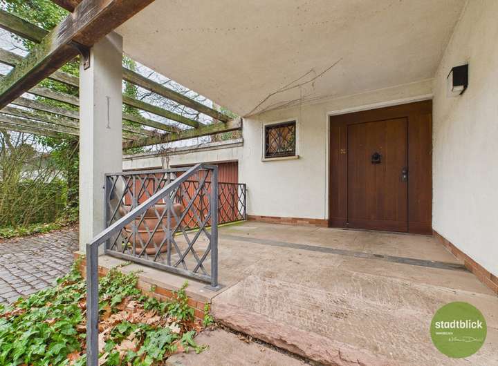 Der Bereich vor dem Haus ist, geschützt durch Hecken und alten Baumbestand, als großzügiger Terrassen- und Gartenbereich angelegt. Hier befindet sich auch die gepflasterte Zufahrt zum Anwesen sowie zur angrenzenden Doppelgarage. Der idyllische, parkartige Garten bietet nicht nur eine ansprechende Naturkulisse, sondern auch ausreichende Privatsphäre für entspannte Stunden im Freien. Gemütliche Stunden lassen sich zudem auf der großen Terrasse sowie dem kleinen seitlichen Balkon genießen.