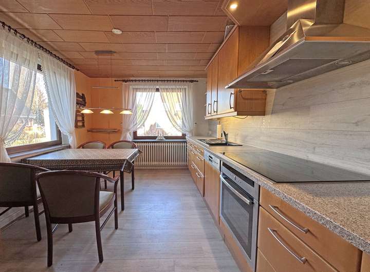 Das Obergeschoss verfügt über weitere Zimmer, teilweise mit Blick in den Garten, sowie über ein Duschbad. Zusätzlich ist hier eine weitere Küche vorhanden, wodurch die Nutzung dieser Etage sehr flexibel gestaltet werden kann.