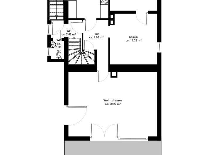 Im Erdgeschoss befinden sich ein Wohnzimmer mit direkten Zugang auf die Terrasse, ein Essbereich, eine Küche, ein WC sowie eine Ankleide. Die Raumaufteilung ist funktional und bietet viel Platz für den täglichen Wohnbedarf.