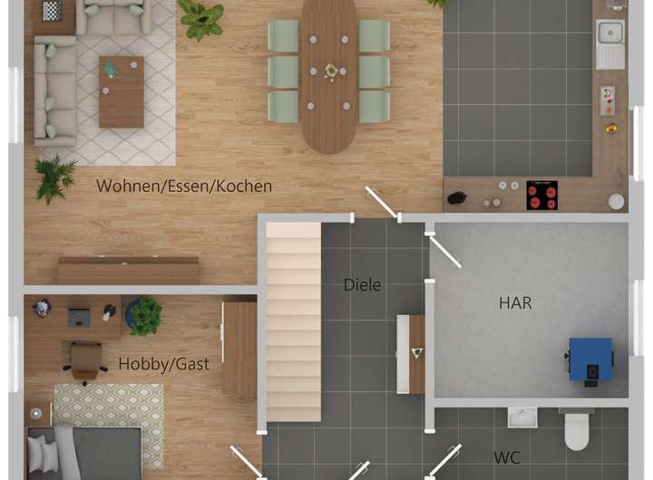 Zusätzlich befindet sich im Erdgeschoss ein großer Hauswirtschaftsraum,