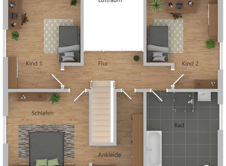 Im Dachgeschoss befinden sich weitere 3 großzügige Schlafräume, ein Ankleide ein Abstellraum, sowie ein großzügiges Bad mit wandhängendem WC .Waschbecken und einer Badewanne.