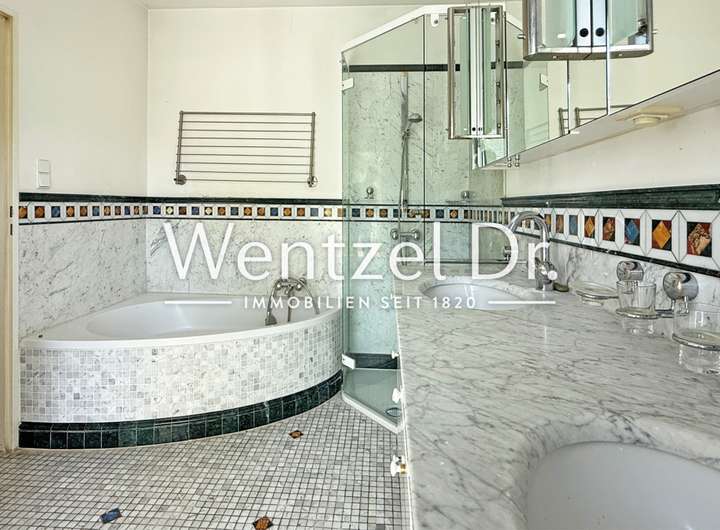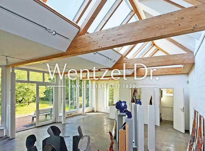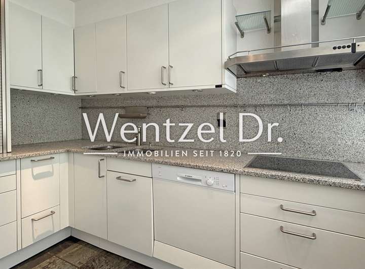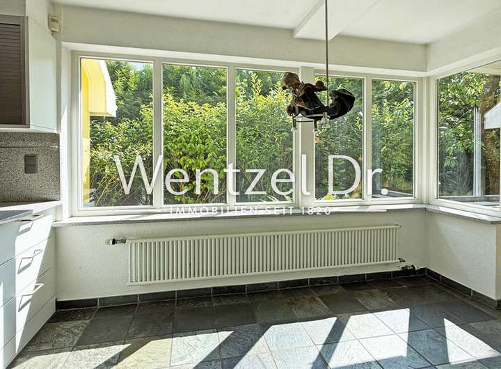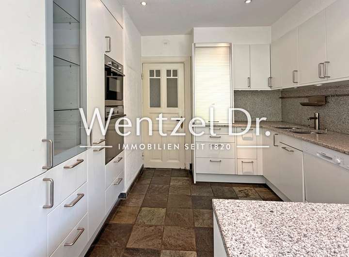 Im Erdgeschoss befinden sich neben dem Wohnzimmer noch zwei großzügige Zimmer, ein Duschbad mit Fenster sowie eine geräumige, hochwertige Bulthaup-Einbauküche mit Platz für einen großen Esstisch. Der Küchenbereich wurde ca. 1980 durch einen Anbau erweitert, wodurch zusätzlicher Raum und Licht gewonnen wurde. Von hier gelangen Sie auch direkt auf den überdachten Terrassenbereich.