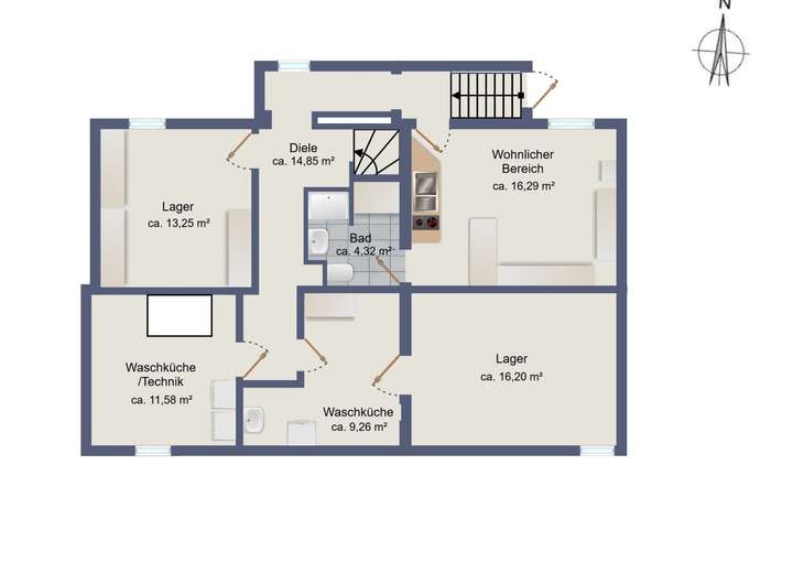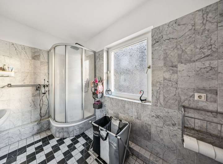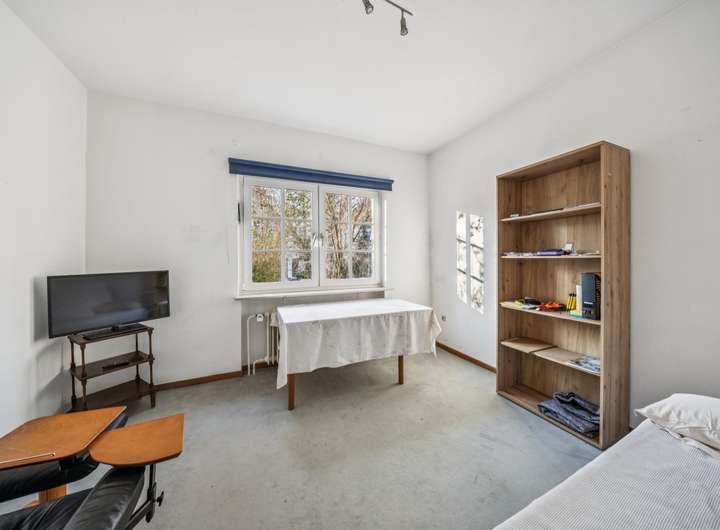 Das Haus ist voll unterkellert. Das Untergeschoss verfügt über zwei Lagerräume und zwei Waschküchen. Zusätzlich steht ein separater, wohnlich ausgebauter Bereich mit eigenem Außenzugang zur Verfügung. Dieser Bereich ist nicht als Wohnfläche ausgewiesen, erweitert das Nutzungsspektrum jedoch deutlich und eignet sich ideal für Hobby- oder Arbeitszwecke.