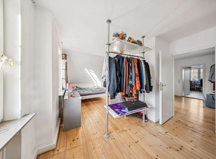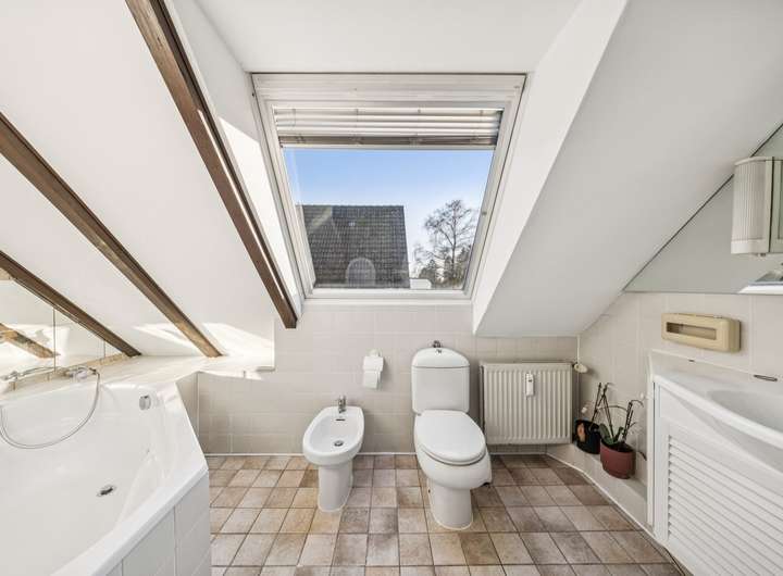 Auf der ersten Ebene der Maisonettewohnung befinden sich ein großzügiges Wohnzimmer mit Zugang zu einer weitläufigen Terrasse, eine Küche mit Platz für einen Essbereich, ein Badezimmer mit Duschkabine und Bidet sowie ein weiterer Raum, der als Schlaf- oder Arbeitszimmer genutzt werden kann. Über eine interne Treppe gelangt man in das Dachgeschoss mit zwei sehr großzügigen Schlafzimmern, einem kleineren Büro sowie einem weiteren Badezimmer mit Badewanne.