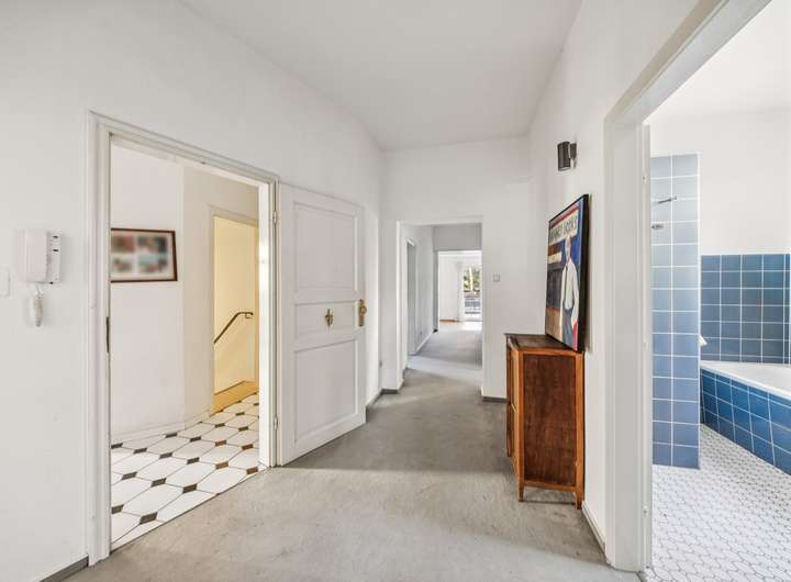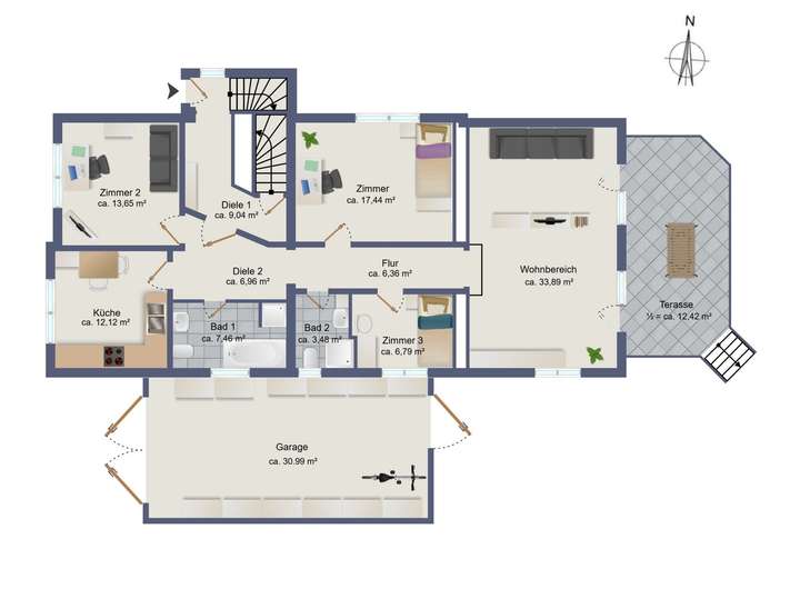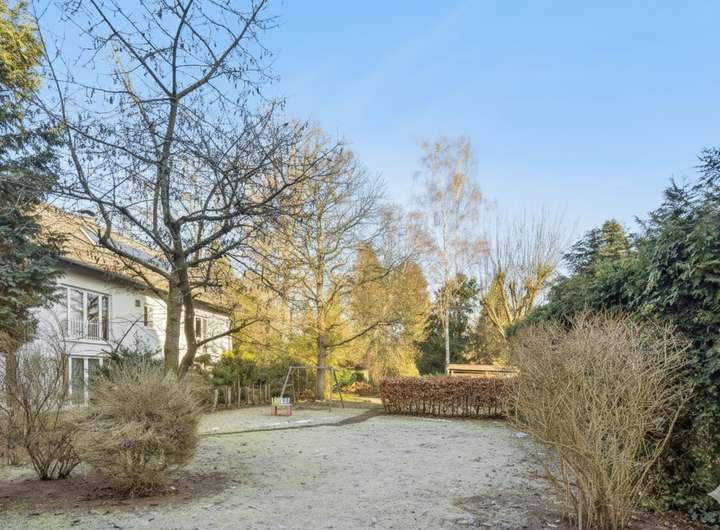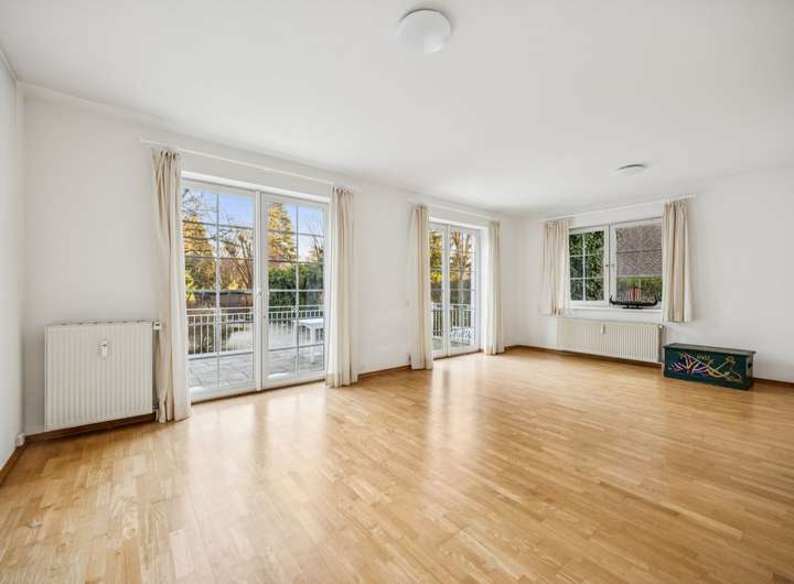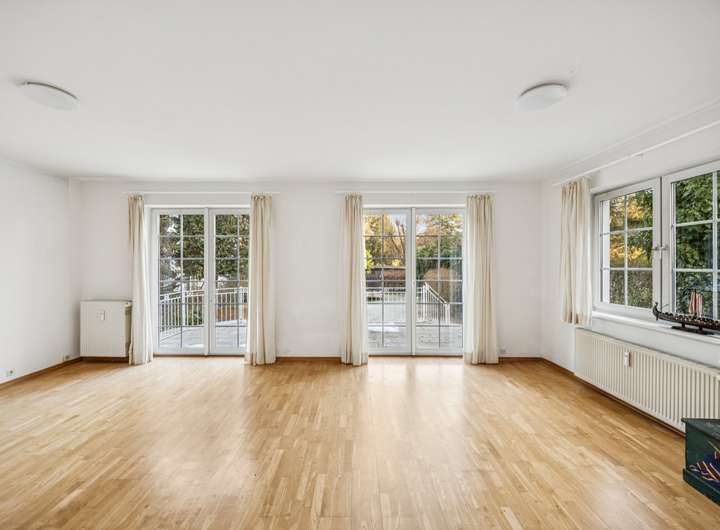 Das Erdgeschoss wird über eine eigene Eingangstür vom gemeinsamen Flur aus betreten. Von der Diele aus erschließen sich drei flexibel nutzbare Zimmer, die sich als Schlaf-, Arbeits- oder Gästezimmer eignen. Ergänzt wird diese Ebene durch eine geräumige Küche sowie zwei Badezimmer, eines mit Badewanne und eines mit Dusche. Der großzügige Wohnbereich bildet den Mittelpunkt und bietet direkten Zugang zu einer großen Terrasse mit Blick in das weitläufige Grundstück.