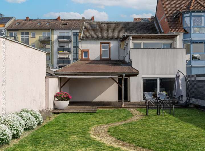 Das Ensemble besteht aus zwei Mehrfamilienhäusern mit insgesamt neun Wohneinheiten, ergänzenden Gewerbeflächen sowie einem weitläufigen Innenhof mit Garagen. Hier treffen gewachsene Bausubstanz und zeitgemäßer Wohnkomfort aufeinander – eine Kombination, die heute gefragter ist denn je.
