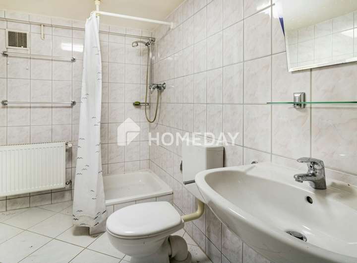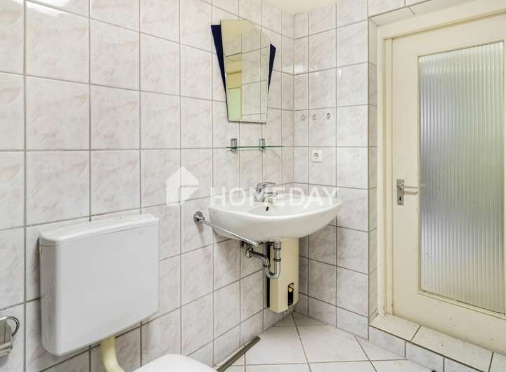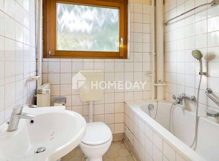 Im Inneren präsentiert sich die Immobilie mit einer soliden, funktionalen Ausstattung. Hervorzuheben sind die zwei Bäder: Das Bad im Erdgeschoss ist mit einer Badewanne ausgestattet und verfügt über Tageslicht, während sich im Kellergeschoss ein innenliegendes Badezimmer mit Dusche befindet. Die Wohnräume sind mit Fliesen und Linoleum ausgelegt und unterstreichen den praktischen Charakter der Immobilie.