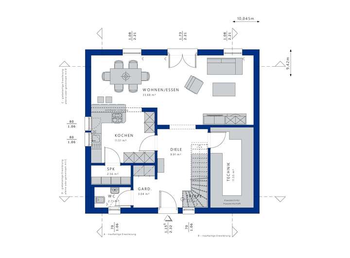 Das projektiert Fertighaus EVOLUTION 154 von Bien-Zenker steht für Vielfalt und Individualität in Architektur und Design. Mit einer großzügigen Wohnfläche von 154 m² und einer durchdachten Raumaufteilung bietet es Platz für die ganze Familie. Der attraktive Eingangsbereich führt Sie direkt in ein lichtdurchflutetes Wohn- und Esszimmer, das sich über die gesamte Hauslänge erstreckt und somit eine einladende Atmosphäre schafft. Der offene Übergang zur großen, modernen Küche, ergänzt durch eine separate Speisekammer, eröffnet vielfältige Nutzungsmöglichkeiten - ob für gemeinsame Kochabende oder gesellige Stunden mit Freunden und Familie. Die drei Schlafzimmer, die im Obergeschoss liegen, bieten Ihnen Rückzugsmöglichkeiten, während das großzügige Wellness-Bad den perfekten Ort zur Entspannung schafft. Das komplette Konzept des EVOLUTION 154 ist darauf ausgelegt, Ihre individuellen Wünsche und Vorstellungen zu realisieren und ein Zuhause zu schaffen, das sowohl funktional als auch ästhetisch ansprechend ist.