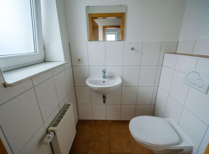 Der offene Wohn-Essbereich mit integrierter Küche bildet den zentralen Wohnbereich des Hauses. Eine Einbauküche ist vorhanden. Zusätzlich steht im Erdgeschoss ein separates Gäste-WC zur Verfügung. Das Badezimmer im Dachgeschoss ist mit Dusche und Tageslicht ausgestattet.