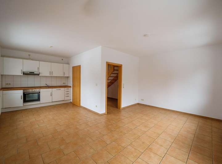 Im Erdgeschoss befinden sich der offene Wohn-Essbereich mit integrierter Küche sowie ein Gäste-WC. Von hier aus besteht Zugang zur Terrasse.
