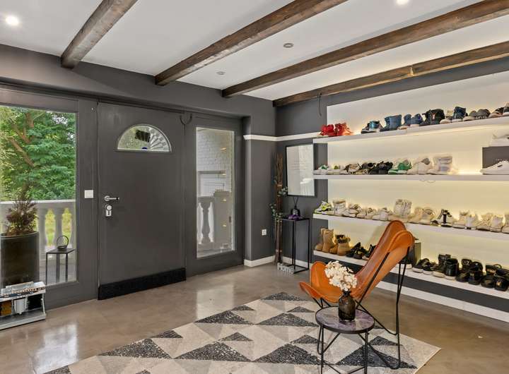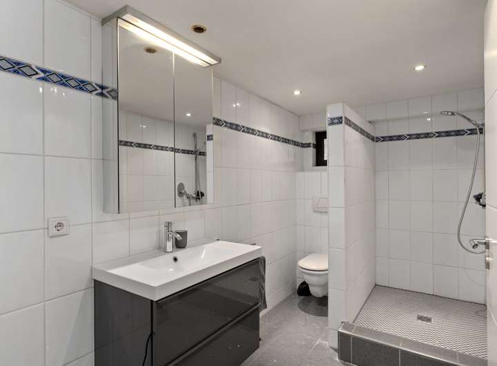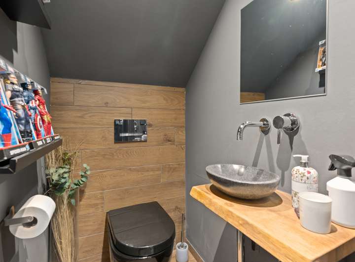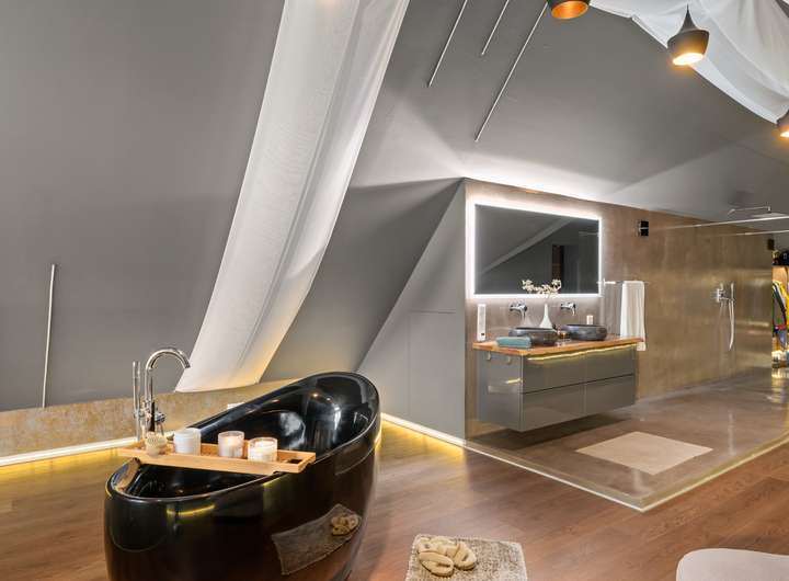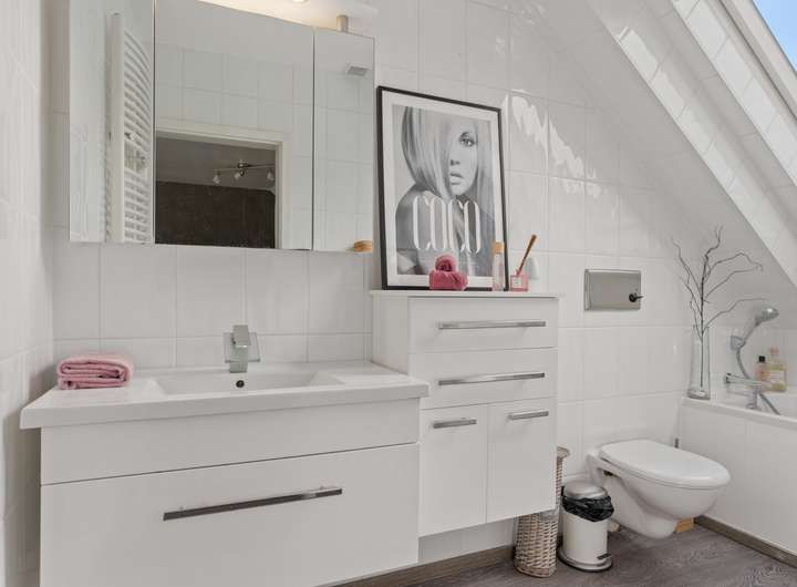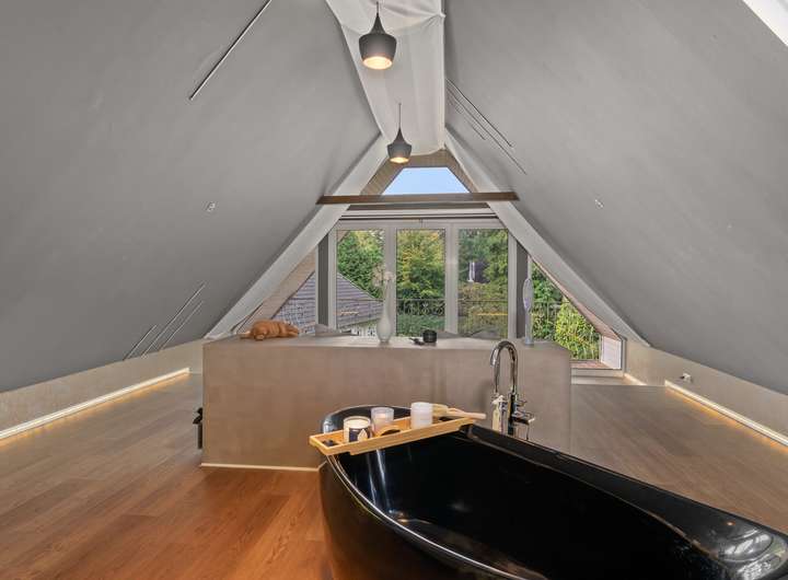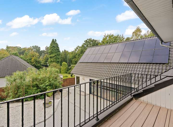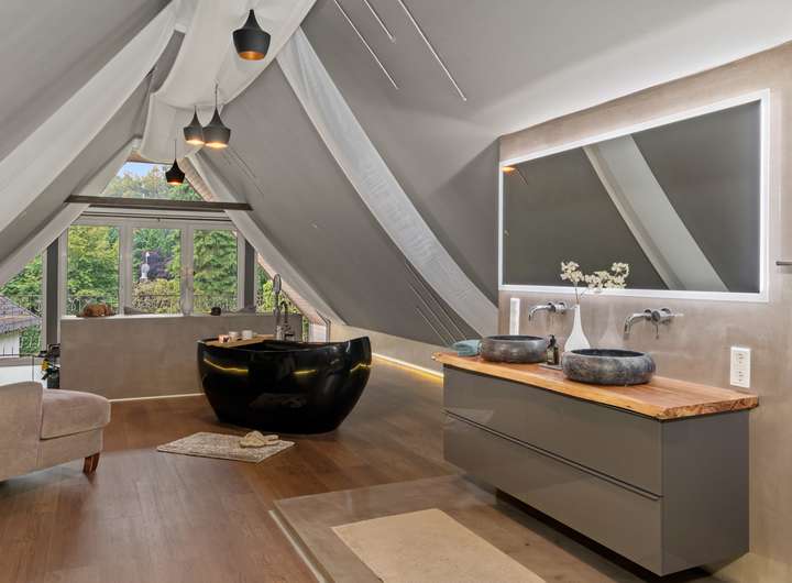 Im Erdgeschoss befindet sich ein modernes Badezimmer mit einer Regenwalddusche und fugenlosem Boden, während das Master-Bathroom im Obergeschoss mit einer freistehenden Badewanne, Doppelwaschbecken und einer walk in Regendusche ausgestattet ist. Der Gästebereich mit eigenem Bad und Balkon ermöglicht Besuchern einen komfortablen Aufenthalt. Mehrere begehbare Kleiderschränke bieten ausreichend Stauraum für die ganze Familie.