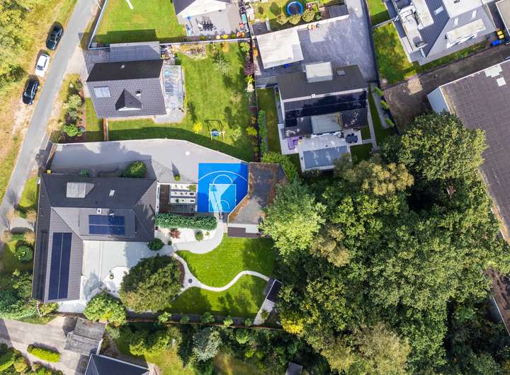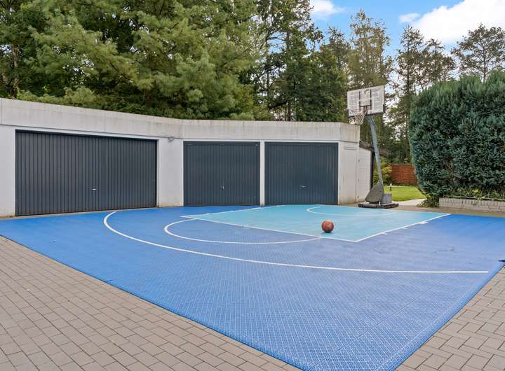 Das Haus verfügt über einen exklusiven Wellnessbereich mit zwei Whirlpools in einem ausgebauten Poolbereich, der bei Bedarf wieder in einen voll funktionsfähigen Pool umgewandelt werden kann. Der angrenzende Duschbereich ermöglicht direkten Zugang zur Terrasse, und die im Garten befindliche finnische Sauna bietet Entspannung mit Blick ins Grüne. Der blickdichte Garten in Süd-West-Ausrichtung ist mit einer automatischen Bewässerungsanlage ausgestattet und bietet viel Platz zum Entspannen oder Spielen. Ein Basketballplatz auf dem Garagenhof ergänzt die Freizeitanlagen.