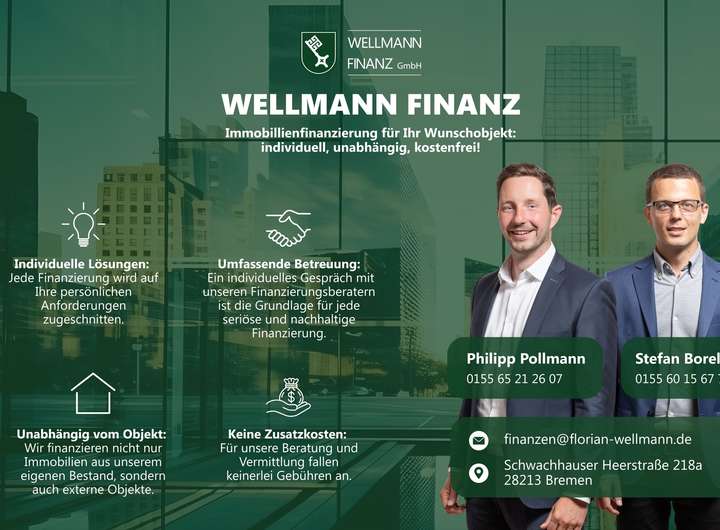 Die Florian Wellmann Immobilien GmbH hat sich auf den Verkauf und die Vermietung von hochwertigen Immobilien spezialisiert. Seit Jahren sind wir erfolgreich am Immobilienmarkt tätig. Wir verkaufen und vermieten exklusive und außergewöhnliche Objekte in den bevorzugten Lagen von Bremen & Umgebung.