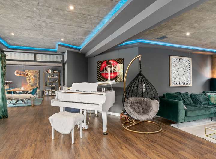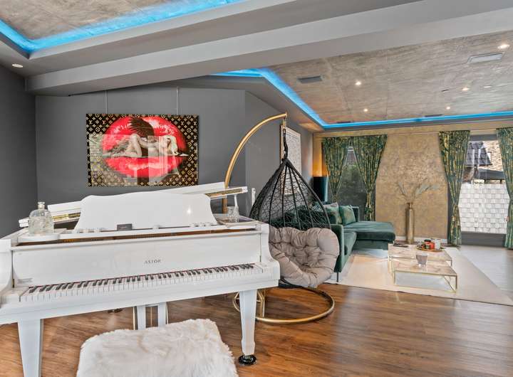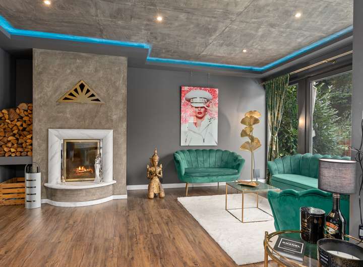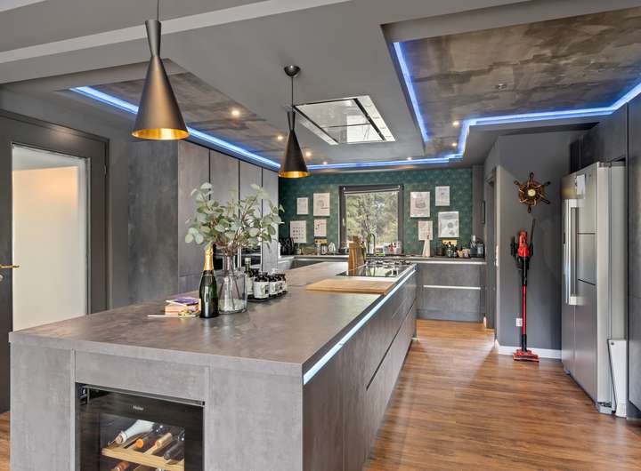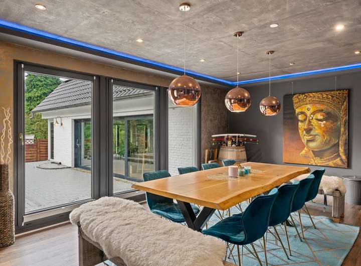 Im Erdgeschoss empfängt Sie ein lichtdurchfluteter Wohnbereich, der mit einem Kamin und einer Dolby-Athmos Anlage für entspannte Abende ausgestattet ist. Der offene Essbereich bietet direkten Zugang zur Terrasse und schafft eine einladende Atmosphäre für gesellige Abende. Die angrenzende Luxusküche überzeugt mit einer großen Kochinsel und hochwertigen Geräten der Marke Neff. Ein Teppanyaki-Kochfeld, Gas- und Induktionsherd, Tellerwärmer, Weinkühlschrank und viele weitere Features machen diese Küche zum Traum für alle Hobbyköche. Über einen separaten Zugang gelangen Sie bequem von der Auffahrt direkt in die Küche, perfekt für das Anliefern von Einkäufen.