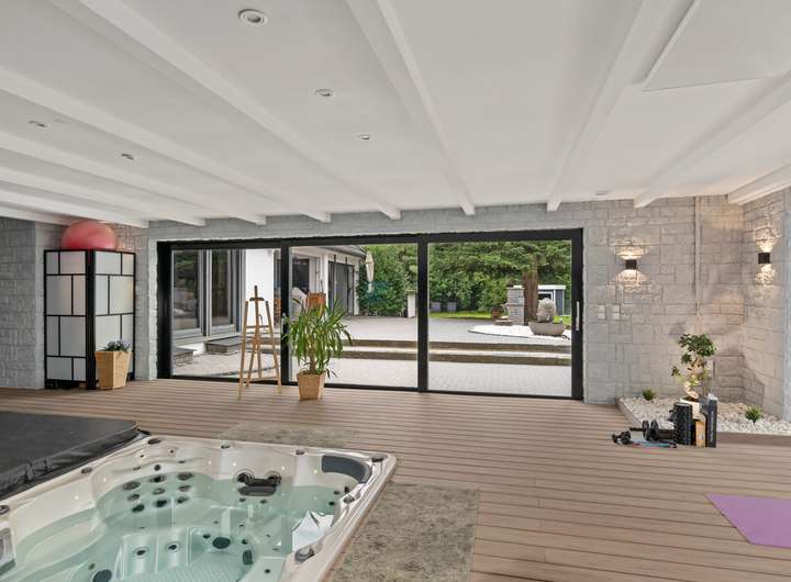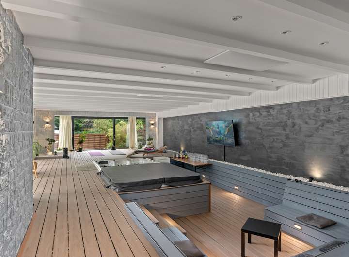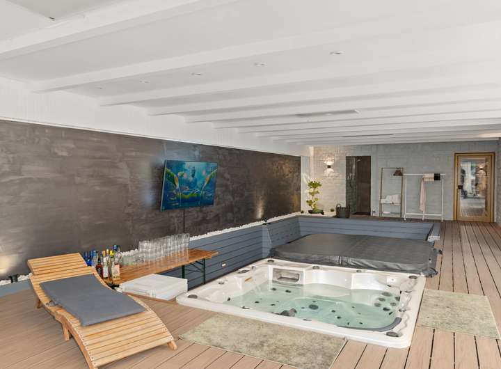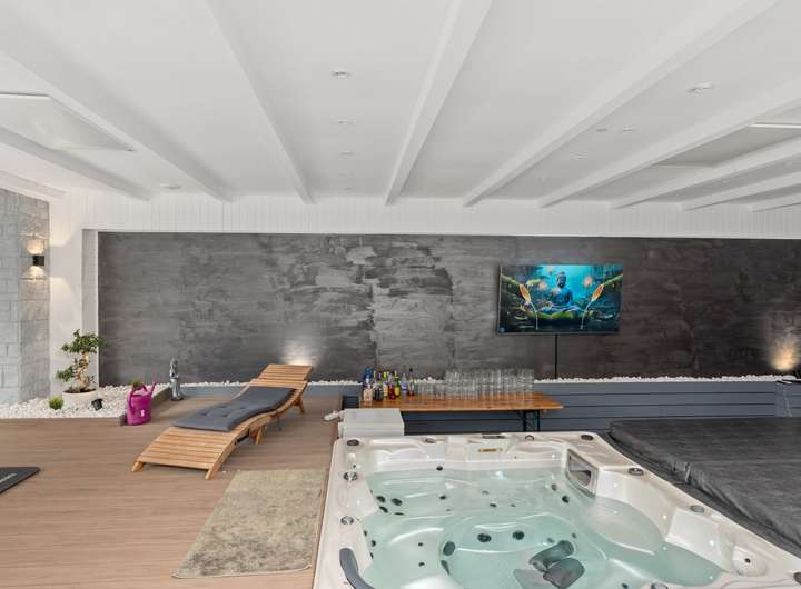 + Exklusiver Wellnessbereich mit zwei Whirlpools, ausgebautem Poolbereich (kann wieder aktiviert werden), Duschbereich und direktem Zugang zur Terrasse