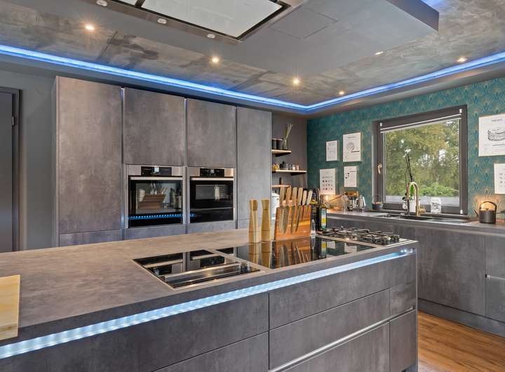 + Luxusküche mit großer Kochinsel und hochwertigen Neff-Elektrogeräten: Teppanyaki-Kochfeld, Gas- und Induktionsherd, Tellerwärmer, Weinkühlschrank, u. v. m.