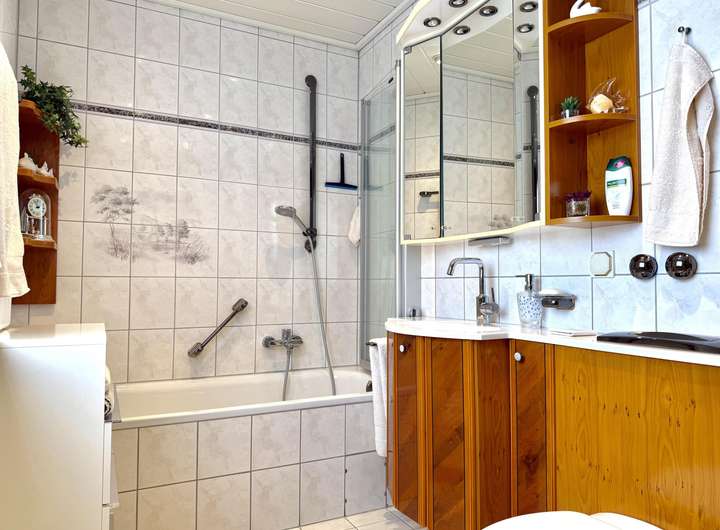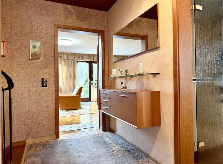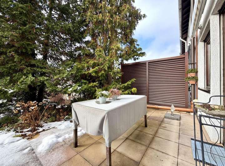 Im Erdgeschoss des Hauses befinden sich der einladende Eingangsbereich, eine Küche, ein Gäste-WC sowie das lichtdurchflutete Wohnzimmer mit Essbereich. Die am Wohnzimmer angrenzende, eingewachsene Terrasse mit Süd-West-Ausrichtung lädt zum Verweilen ein.