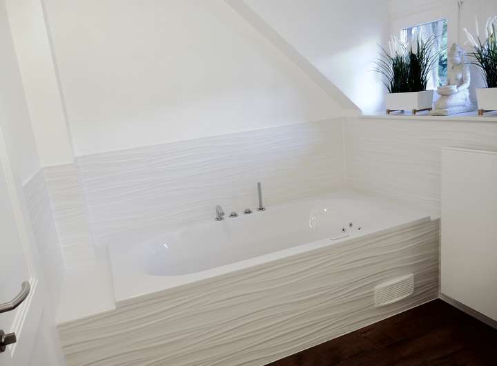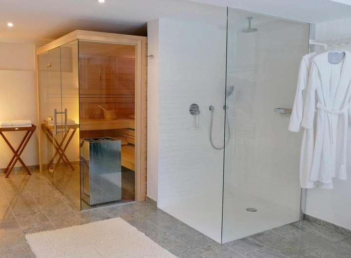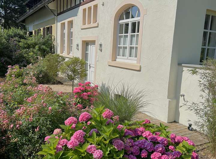 Aus dem großen Wellnessbereich (30 qm) mit hochwertiger Sauna und ebenerdiger Wellnessdusche gelangen Sie auf die große dritte Terrasse (20 qm, mit elektrischer Markise) und in den schön eingewachsenen Garten mit automatischer Bewässerung, der trotz seiner zentralen Lage uneinsehbar und ruhig gelegen ist.