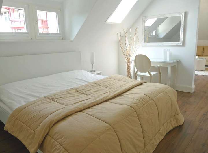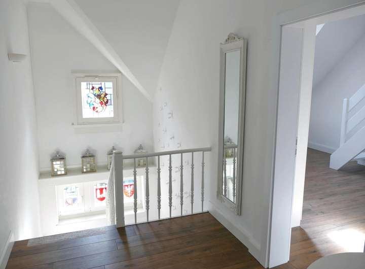 Das luftige Treppenhaus führt Sie in die obere Etage mit großem Flurbereich (Deckenhöhe über 4 m), 3 Zimmern, 2 Bädern, sowie der zweiten großen Dachterrasse mit Burgblick. Die drei Zimmer (je ca. 16 qm) können als Schlafzimmer, Kinderzimmer, Bibliothek etc. vielseitig genutzt werden. Ein weiteres Zimmer, welches hochwertig mit Echtholzparkett ausgestattet wurde, ist über eine maßangefertigte Massivholztreppe erreichbar.