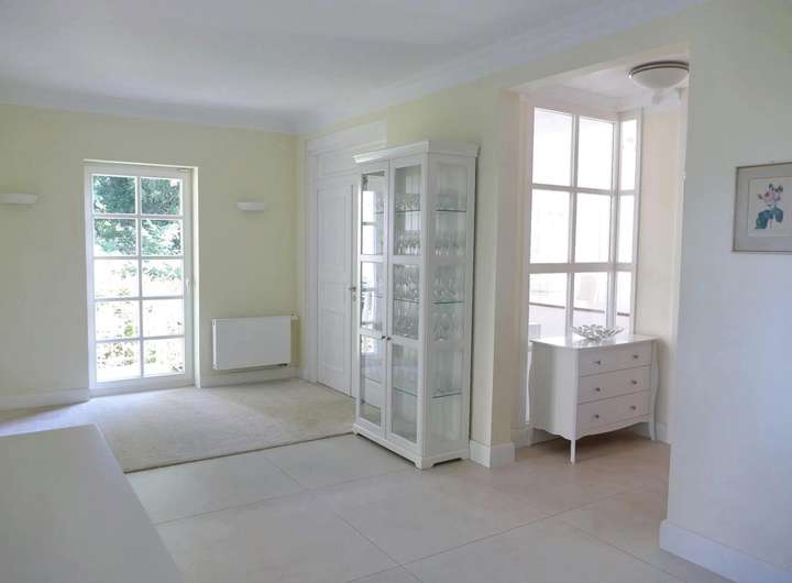 Sie betreten die Stadtvilla durch den geschmackvoll angelegten Vorgarten. Über das zentrale Treppenhaus und die Garderobe gelangen Sie in den großzügigen Wohn-/Essbereich des Hauses (52 qm, Esszimmer abtrennbar), an den sich ein Arbeitszimmer (15 qm) und die Küche (16 qm) anschließen. Alle Räume sind mit hochwertigen großformatigen, italienischen Fliesen ausgestattet und durch große Flügeltüren verbunden. Deckenhöhen von 2,7 m verleihen dem Haus ein großzügiges Raumgefühl. Über eine Außentreppe gelangen Sie direkt auf die erste uneinsehbare Terrasse mit eigenem Bachlauf.