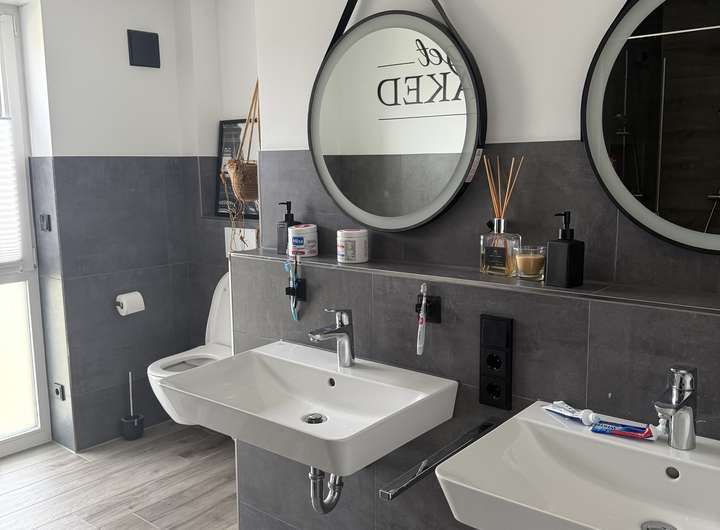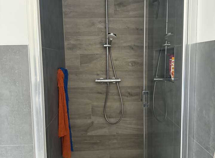 • Modern ausgestattetes Badezimmer und Gäste- WC mit Dusche