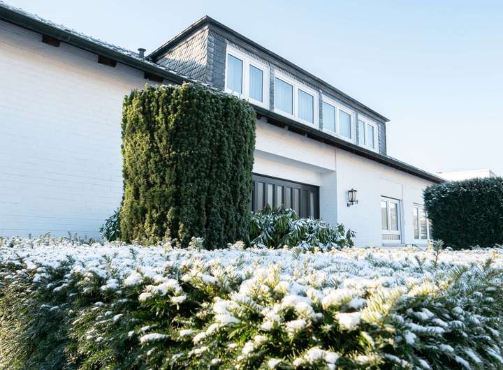 Großzügige Wohnbereiche mit Kamin und großen Glasfronten, ein charaktervoller Empfang, fünf Schlafzimmer, ein Arbeitszimmer mit Bibliothekscharakter sowie vielseitige Hobby- und Wirtschaftsräume prägen den Charakter dieses Hauses. Fließende Übergänge zu Terrasse und Garten, der Außenkamin im Freien sowie ein ehemaliger Indoor-Poolbereich mit Entwicklungspotenzial unterstreichen die architektonische Besonderheit und Zukunftsfähigkeit des Anwesens.