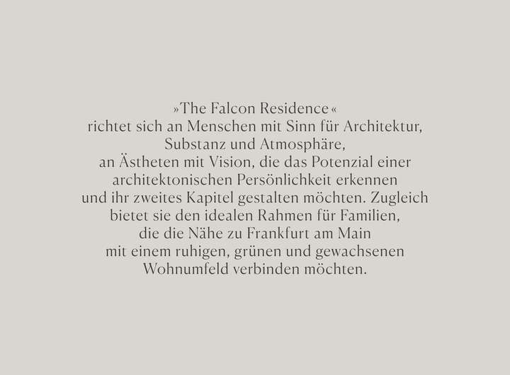 »The Falcon Residence« richtet sich an Menschen mit Sinn für Architektur, Substanz und Atmosphäre, an Ästheten mit Vision, die das Potenzial einer architektonischen Persönlichkeit erkennen und ihr zweites Kapitel gestalten möchten. Zugleich bietet sie den idealen Rahmen für Familien, die die Nähe zu Frankfurt am Main mit einem ruhigen, grünen und gewachsenen Wohnumfeld verbinden möchten.