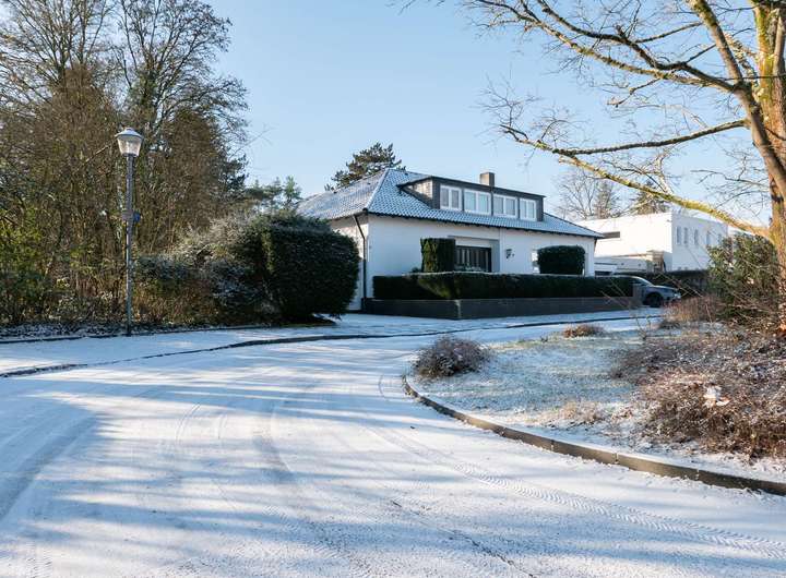 Das Anwesen befindet sich im gewachsenen Wohnquartier Gravenbruch, einem der grünsten und zugleich diskretesten Wohnstandorte im Süden von Frankfurt am Main. Schon in der ursprünglichen Planung wurde der Durchgangsverkehr weitgehend ferngehalten; die Erschließung folgt einer sanft geschwungenen Hauptachse mit Schleife und zahlreichen Stichstraßen, die überwiegend dem Anliegerverkehr dienen. Dadurch entsteht bis heute ein angenehm ruhiges und geschütztes Wohnumfeld.
