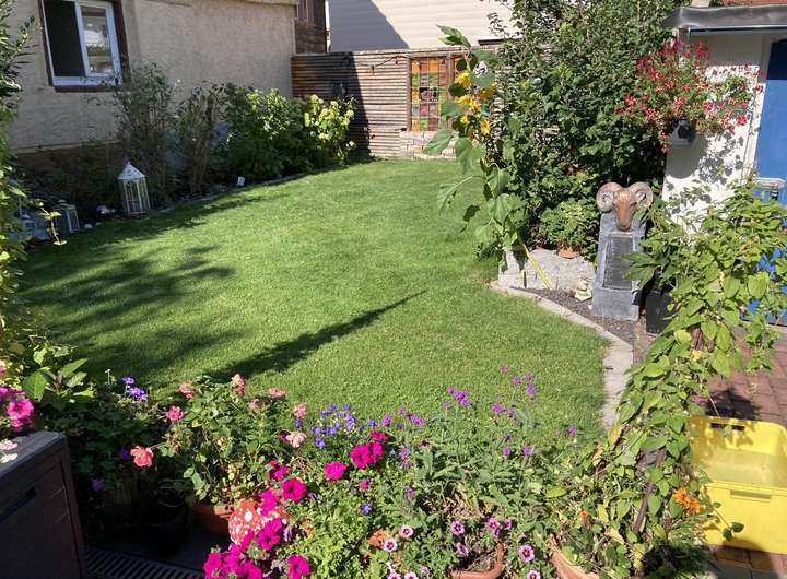 Pflegeleichter Garten: Der Garten ist harmonisch angelegt, mit blickdichten Büschen und einer Auswahl an Obstbäumen, die eine frische Ernte direkt vor der Haustür garantieren.
