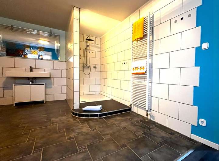 Design: Im Innenbereich erwartet Sie eine neu gestaltete Treppe, die als Blickfang die Etagen miteinander verbindet. Die Böden sind zum größten Teil mit hochwertigem Parkett und Designer-Fliesen belegt.