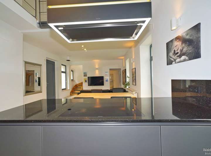 Der moderne Grundriss bietet ein großzügiges helles Wohn-/Esszimmer mit Fußbodenheizung, einer offenen deckenhohen Luxus-Küche von Schüller mit Glasfronten, hochwertigen Geräten von Siemens, Miele, Abzugshaube Berbel, Glaskeramik- Kochfeld und Granitflächen „Indian Galaxy“. Das Haus hat einen geräumigen Teilkeller mit Zugang unter der Treppe.