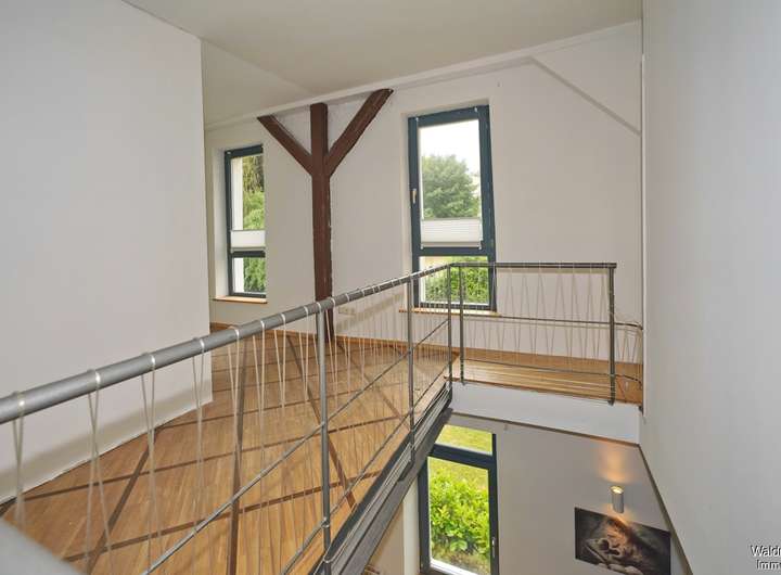 Der Treppenbereich ist durch ein Fenster und eine Lichtkuppel in der Decke sehr hell. Die massive Holztreppe endet auf einem kleinen Flur mit Granitboden. Es gibt im OG drei weitere helle Schlaf- oder Kinderzimmer. Diese sind mit wunderschönem Echtholz- Stäbchenparkett Eiche mithandgefertigten Mahagoni- Intarsien ausgestattet.