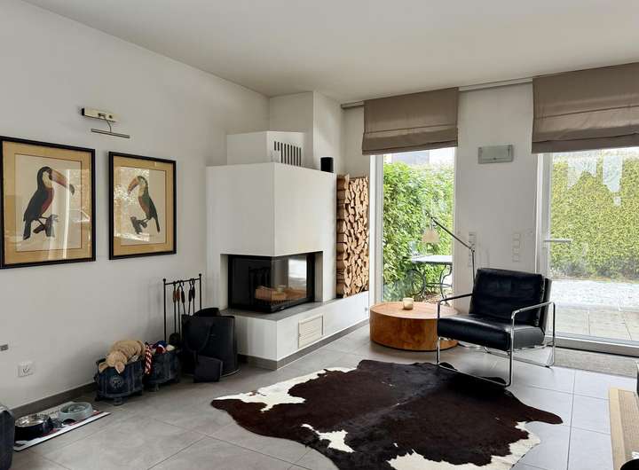 Der Kamin sowie das elegante Wohnzimmer mit direktem Zugang zum Garten verleihen dieser Etage mit rund 90 m² eine besondere Wohnqualität. Ein Gäste-WC ergänzt das Raumangebot auf dieser Ebene.