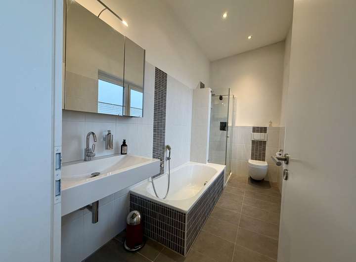 Im Dachgeschoss befinden sich drei komfortable Schlafzimmer, jeweils mit Zugang zu Balkonen auf beiden Seiten des Hauses. Das großzügige Masterbad mit Badewanne und Dusche sowie ein zusätzliches Duschbad unterstreichen den hochwertigen Anspruch dieser Etage.