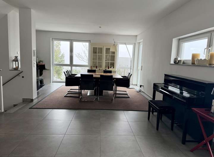 Die offen gestaltete, einladende Küche geht fließend in den lichtdurchfluteten Essbereich über und schafft ein kommunikatives Zentrum für Familie und Gäste.