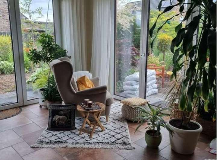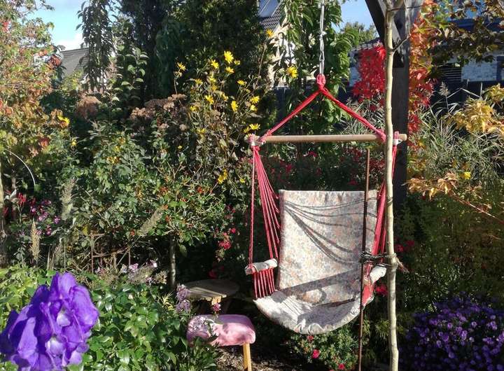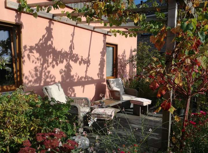 Der Garten ist pflegeleicht mit Stauden (Rückschnitt 1x im Jahr) und kleinen Bäumen, die Sichtschutz bieten (kein Schnitt erforderlich).