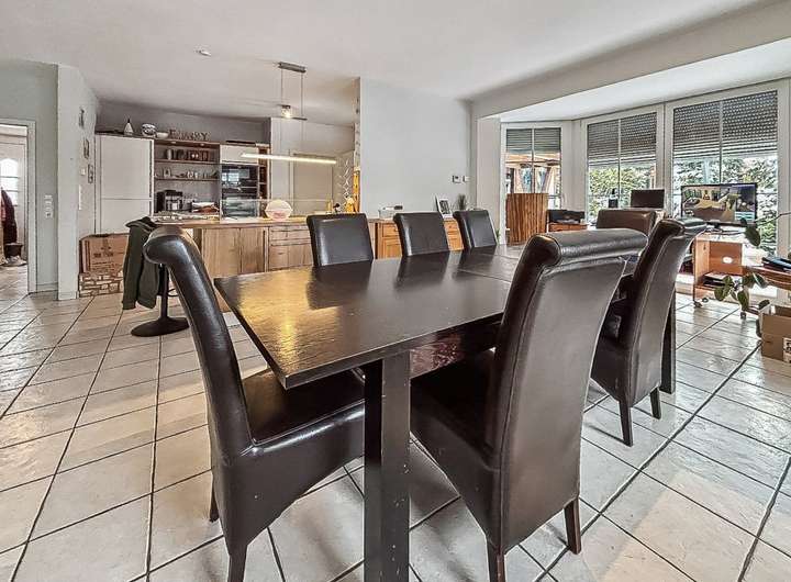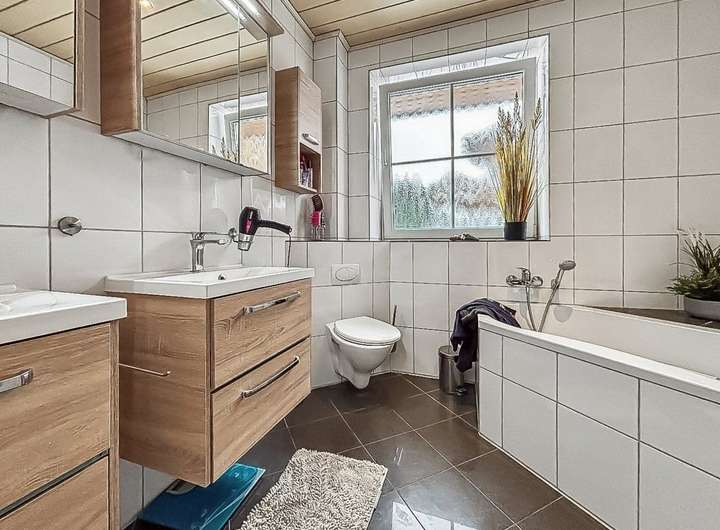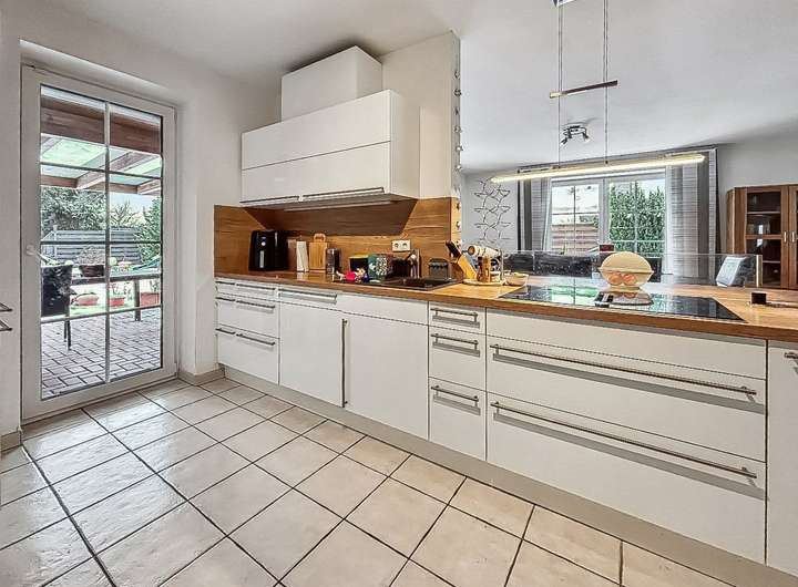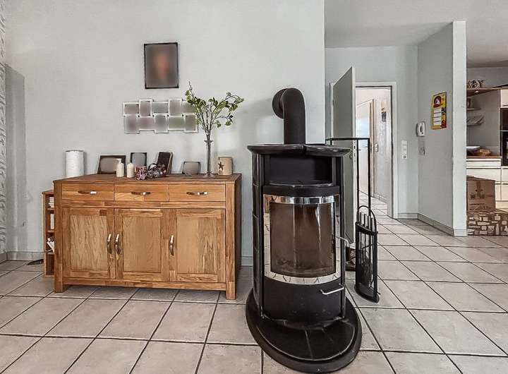 Herzstück des Hauses ist der offene Wohn- und Essbereich mit integrierter Einbauküche und Kaminofen, der für eine behagliche Wohnatmosphäre sorgt. Neben dem Vollbad steht im Eingangsbereich ein Gäste-WC mit Dusche zur Verfügung. Ein Hauswirtschaftsraum, welcher an die Küche grenzt, bietet zusätzlichen Stauraum. Die Fenster mit innenliegenden Sprossen sowie ein heller Erker im Essbereich unterstreichen den wohnlichen Charakter. Das Haus wird mittels einer Fußbodenheizung beheizt. Im Garten befindet sich der Flüssiggastank. Der Wärmeerzeuger wurde ca. 2021 erneuert.