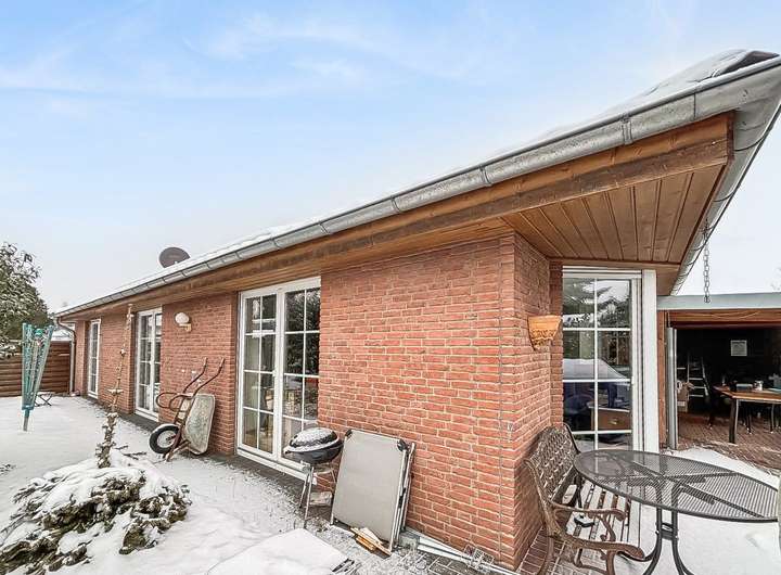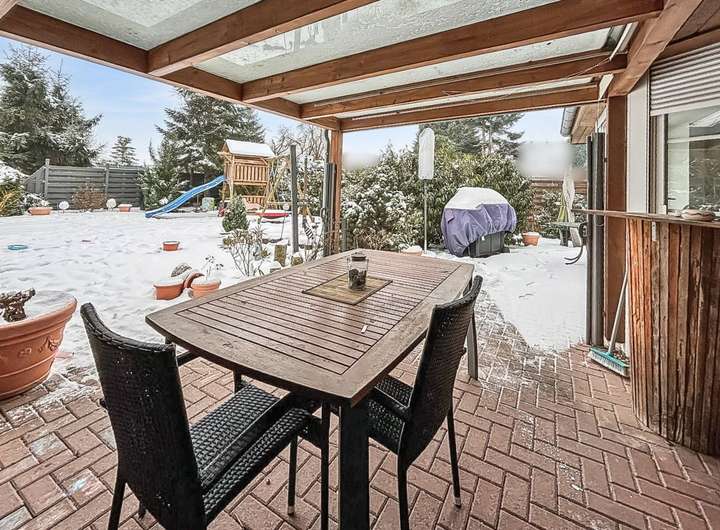 Eine überdachte Terrasse mit angrenzendem Hobbybereich führt in den Garten. Ein Carport, drei Pkw-Stellplätze sowie eine kleine Werkstatt hinter dem Carport runden das Angebot ab.