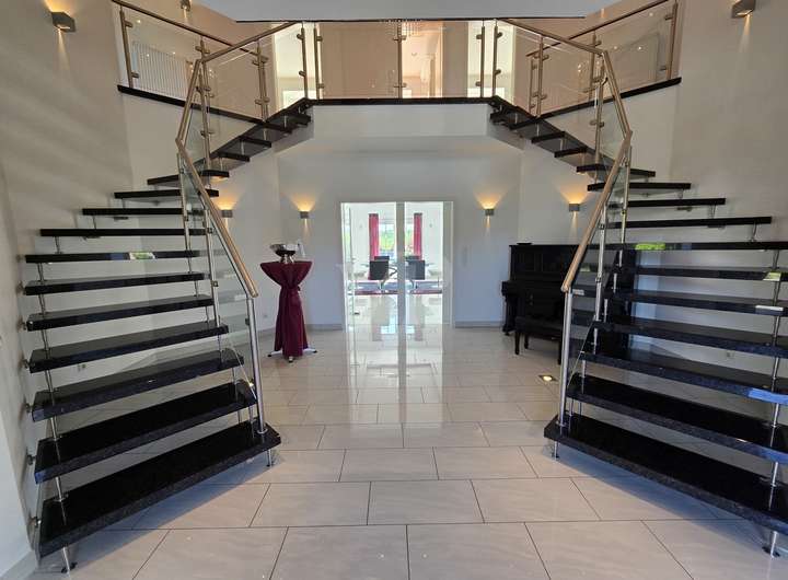 • Empore mit schwarzer, geschwungener Kenngott-Granit-Doppeltreppe mit Edelstahl-Geländer