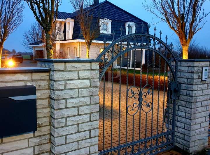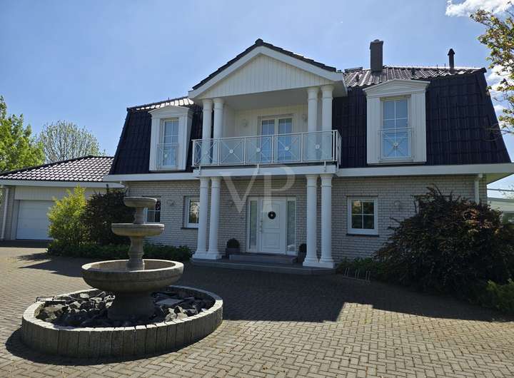Die aufwändige Fassadengestaltung mit Säulen, Lisenen und Fenstergiebeln, das dunkle Mansardendach mit der glasierten Ziegeleindeckung und die helle kontrastierende hinterlüftete Vollklinkerfassade machen es in Verbindung mit den aufwändigen Außenanlagen zu einem repräsentativen Anwesen, welches kaum Wünsche offenlässt.