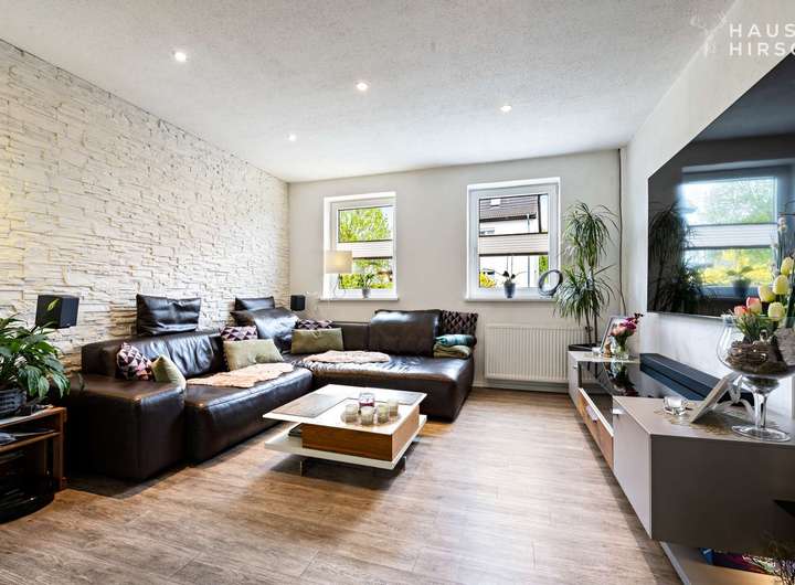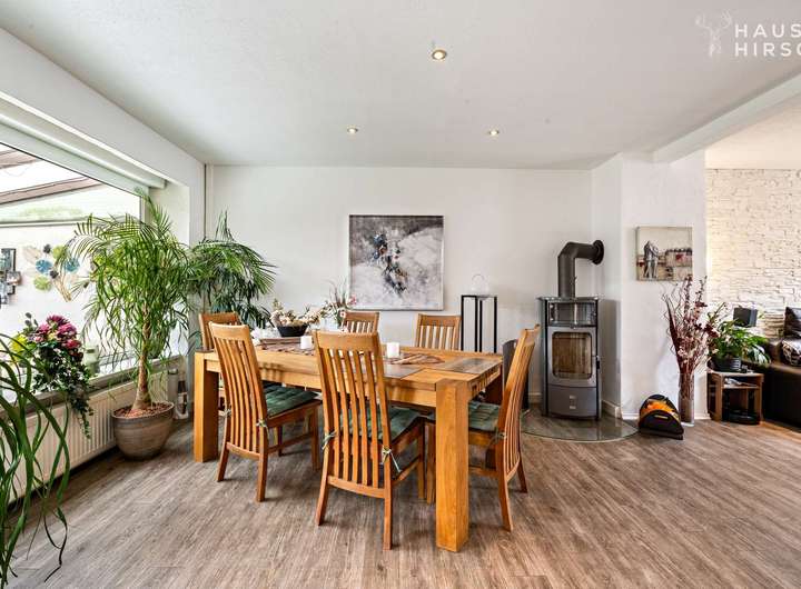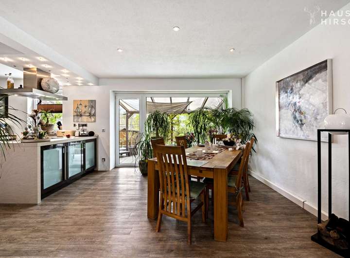 Der offene Wohn-/Essbereich ist großzügig geschnitten und bietet Platz für das gesellige Familienleben oder die Party mit den besten Freunden. Eine große Fensterfront zur Terrasse bietet einen traumhaften Blick in den grünen, pflegeleichten Garten. Der direkte Zugang vom Essbereich zur Terrasse sorgt für fließende Übergänge zwischen Wohnen und Garten.