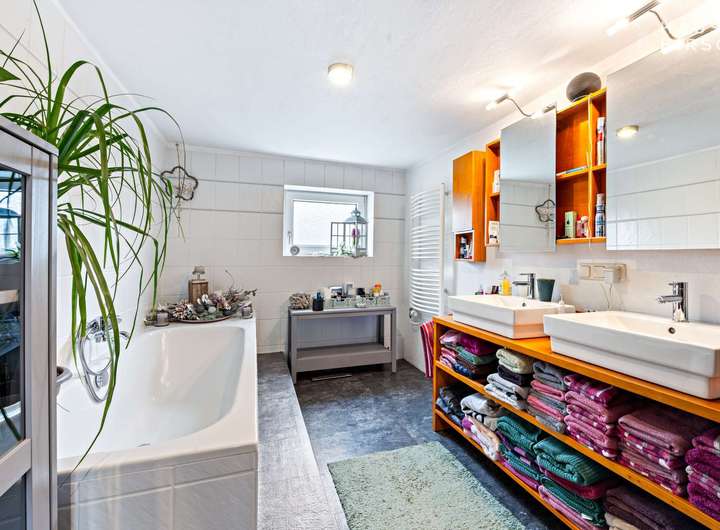 Tageslicht-Badezimmer mit Badewanne, 2 Waschtischen und Badmöbeln.